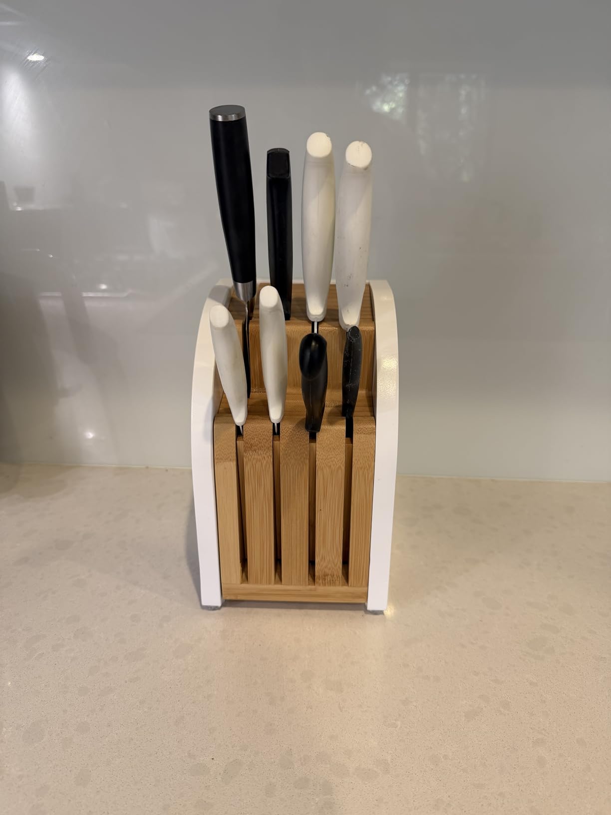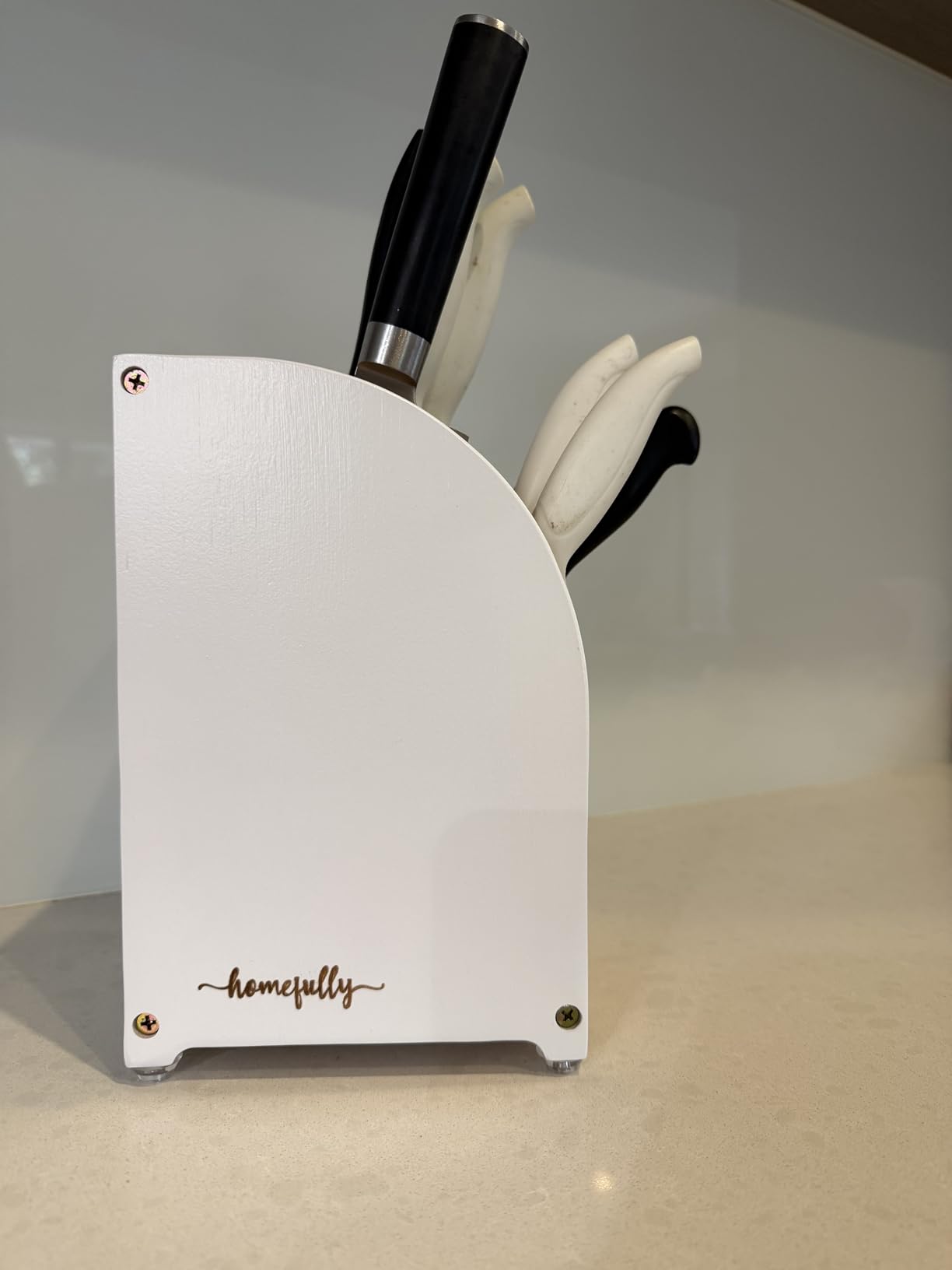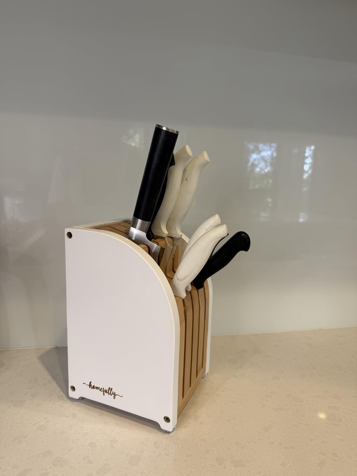 The Homefully knife block is designed to be a stylish statement piece that complements your kitchen decor. It’s perfect for elevating your kitchen space and impressing your guests. With its beautiful bamboo exterior and white accents, it fits all kitchen styles—from modern and simplistic to bohemian and farmhouse. If you prefer a more streamlined look, the knife block can easily be tucked away in your pantry or cupboard while still providing easy access when you need it.